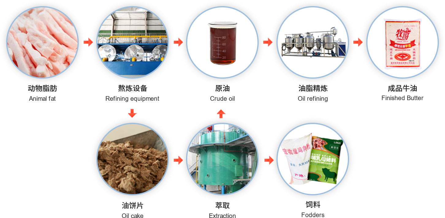 正規大型流水線工藝大致分為:絞肉、輸送、分料、蒸煮、油渣分離、過濾、熬煉毛油、精煉。
